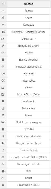 No Wide Chat, essas tarefas são representadas na forma de componentes¹ que o administrador vai utilizar para construir a rotina de atendimento que o ChatBot vai executar.