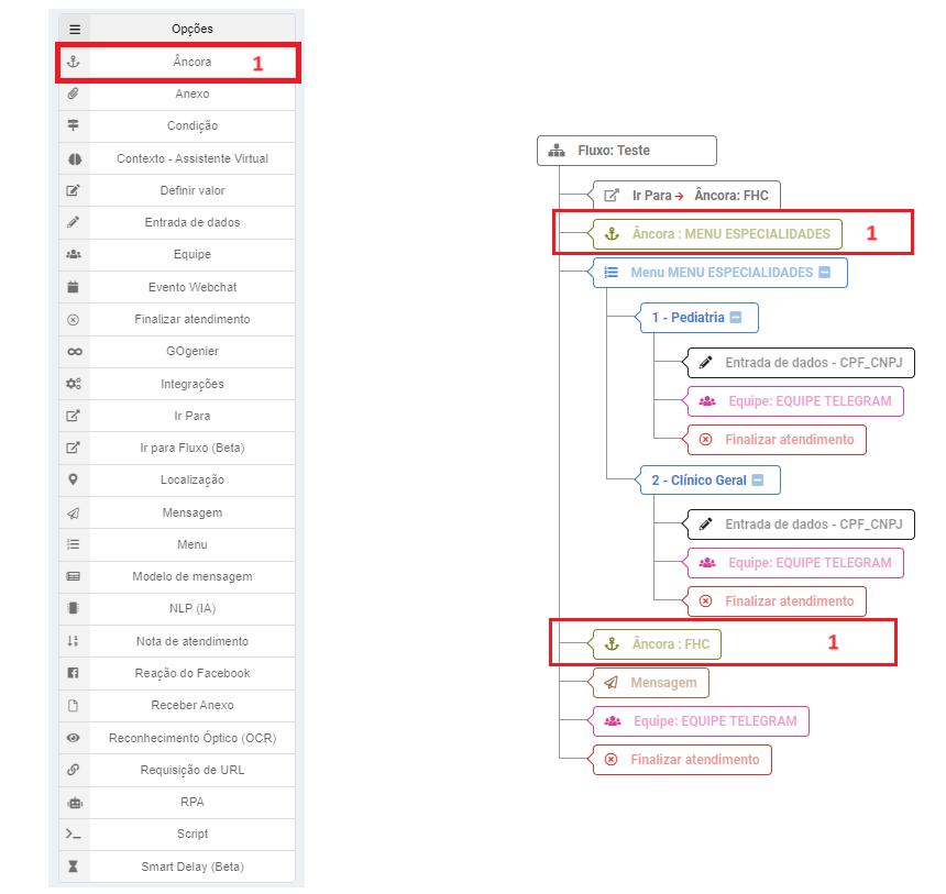 No exemplo abaixo, o ChatBot possui 02 âncoras, sendo: