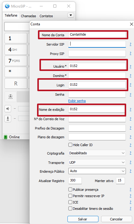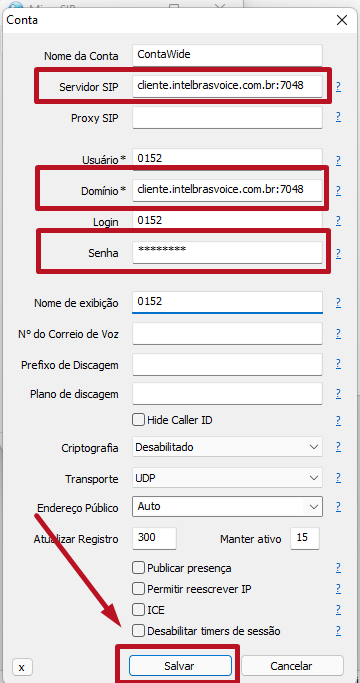 Os campos "Servidor SIP" e "Domínio" preencha com o endereço de "servidor para registro" (sem https://) recebido em seu email com a porta 7048 ao lado conforme abaixo. Por fim, salve da seguinte forma: