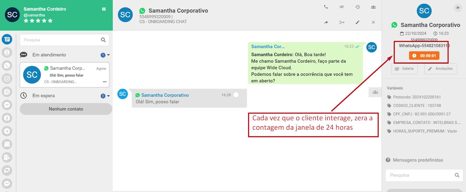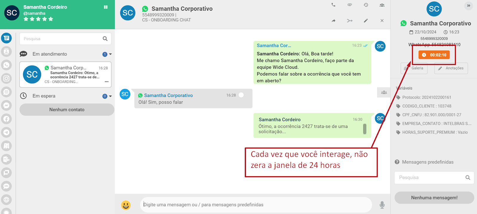 Funciona assim: Quando a caixa de diálogo se abre, inicia-se no seu Wide Chat uma contagem regressiva de 24 horas. Esse tempo ficará correndo a não ser que seu cliente interaja com você.