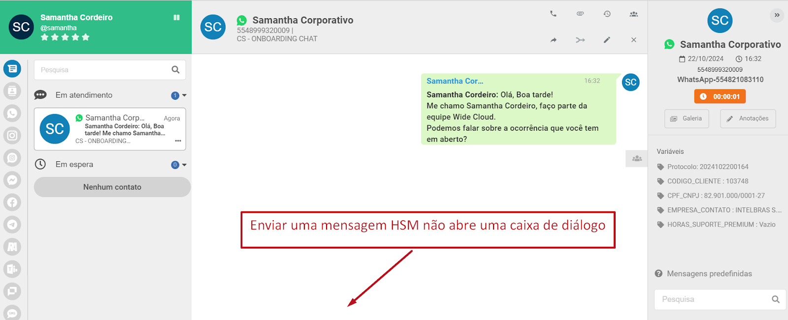 Veja nas imagens abaixo. Note que, após o envio da primeira mensagem ativa, isso não abre uma caixa de diálogo para falar livremente com o cliente. Agora, a partir do momento que o cliente dá a primeira resposta, isso sim abre uma caixa de diálogo para conversar com ele.