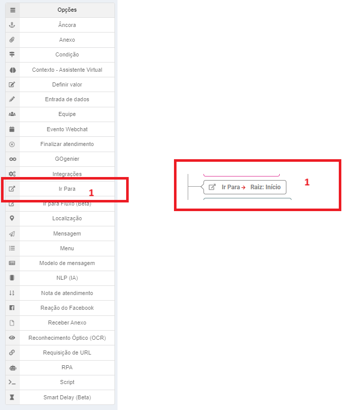 No exemplo abaixo, o ChatBot possui 02 "Âncoras" (marcadas com 1), e 01 "Ir para"(marcadas com 2) configurado para saltar para a Âncora FHC :