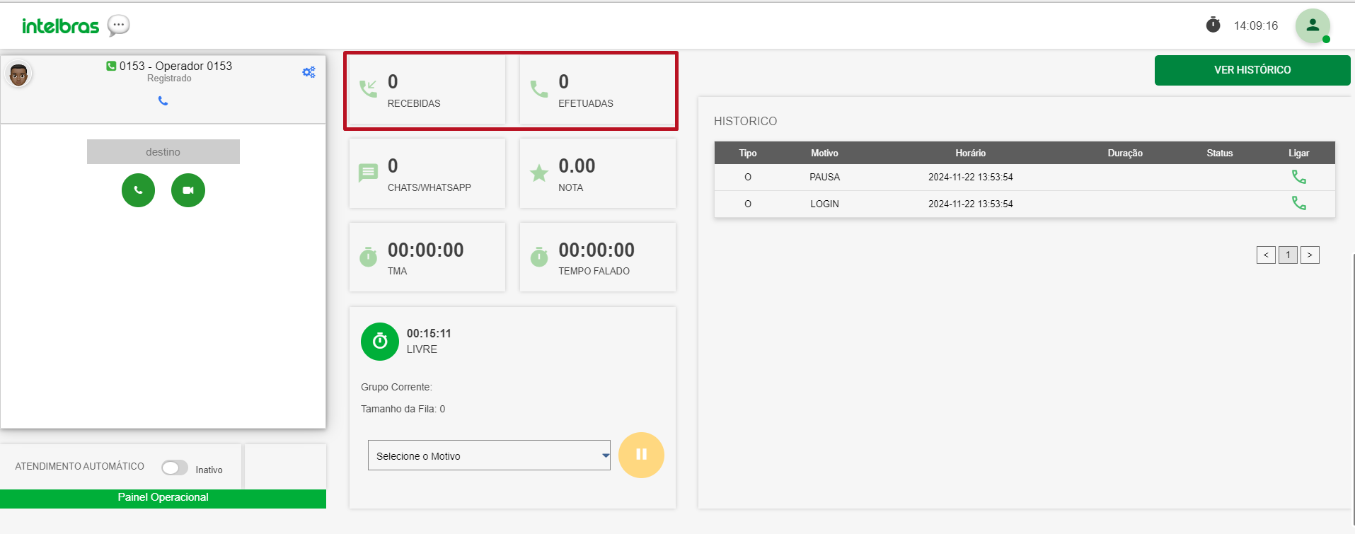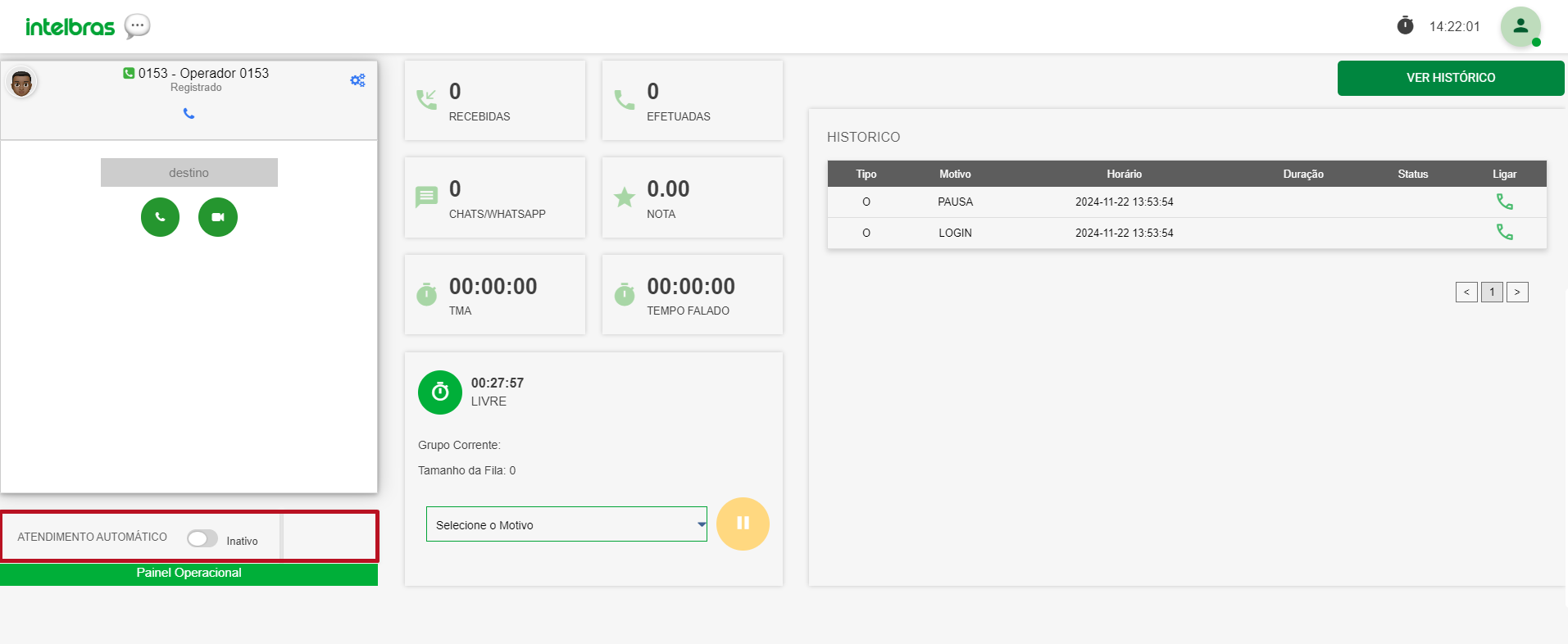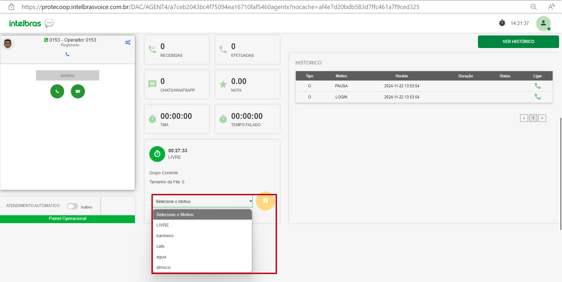 O histórico de pausas também fica visível na tela do agente e seus horários também.