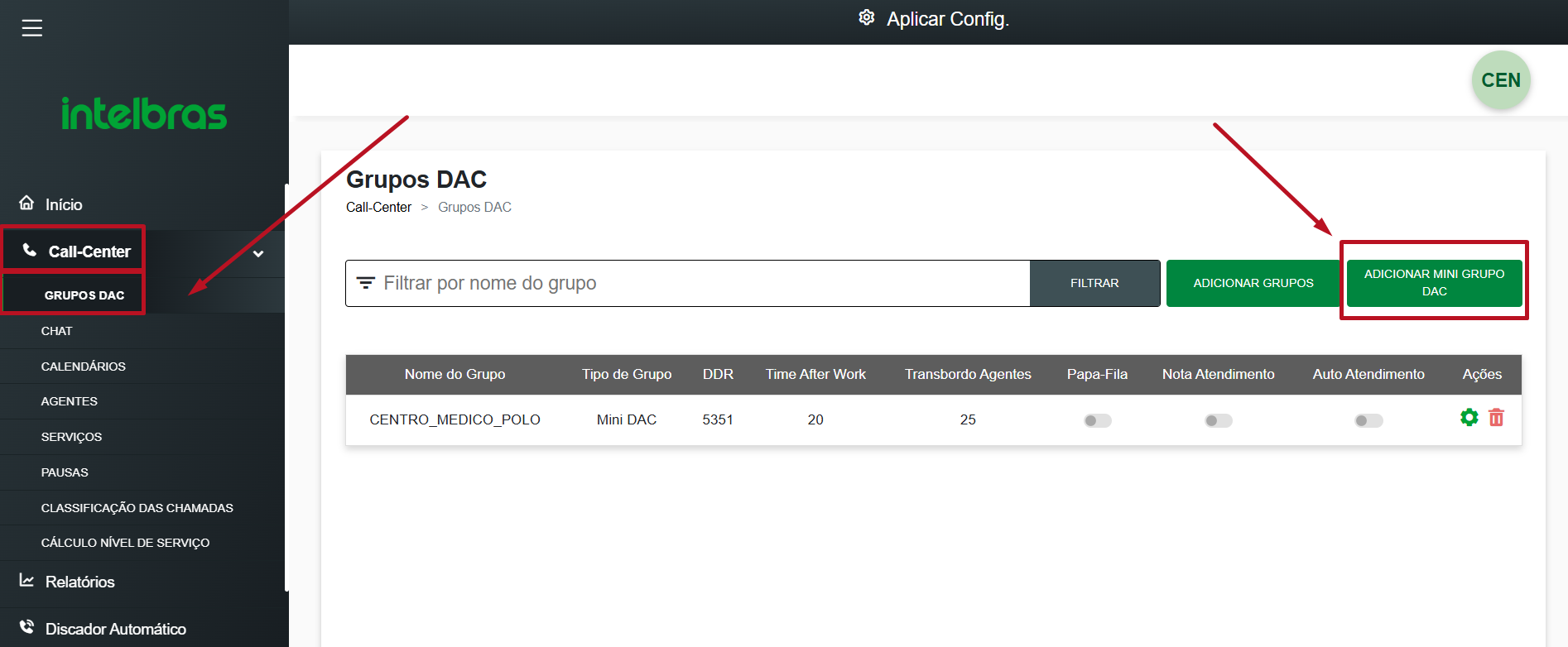2. Para criar um grupo DAC, vá até o menu "Call Center" -> "Grupos DAC" e clique em "Adicionar Mini Grupo DAC".