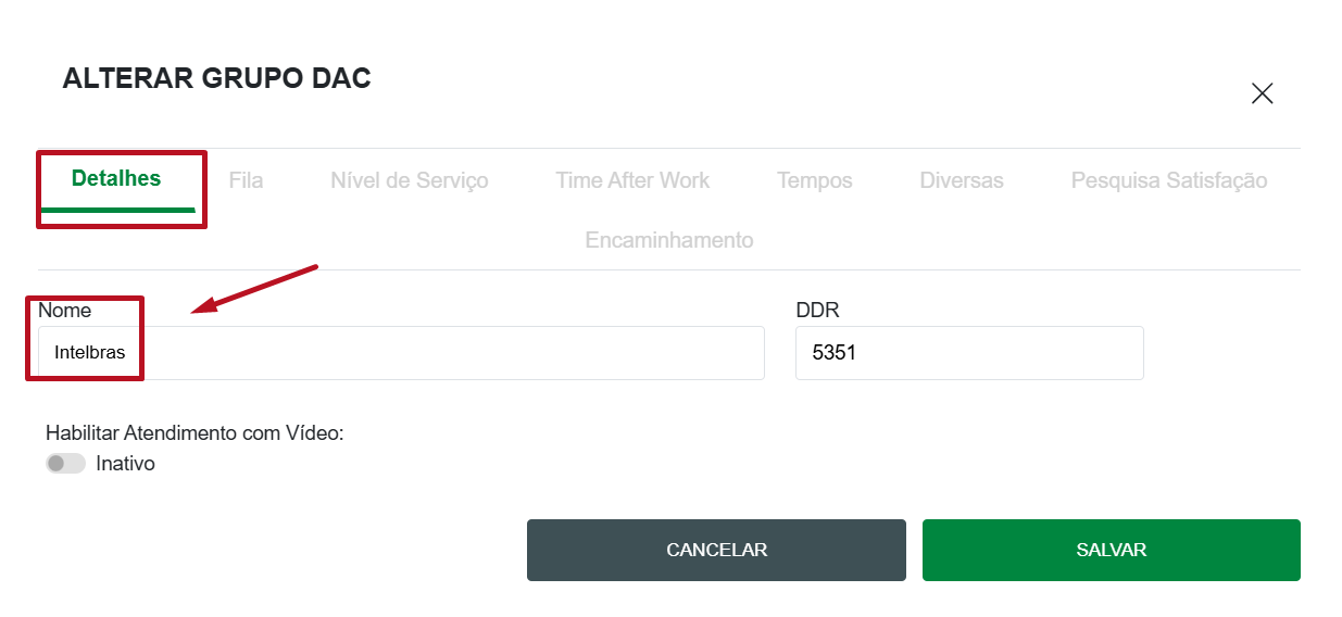 4. Dentro da aba "Detalhes" é possível alterar o nome do seu grupo para algo como "financeiro" o que indique quais ramais pertencem a este serviço. Não altere a numeração DDR (identificação do grupo), pois ela é gerada automáticamente.