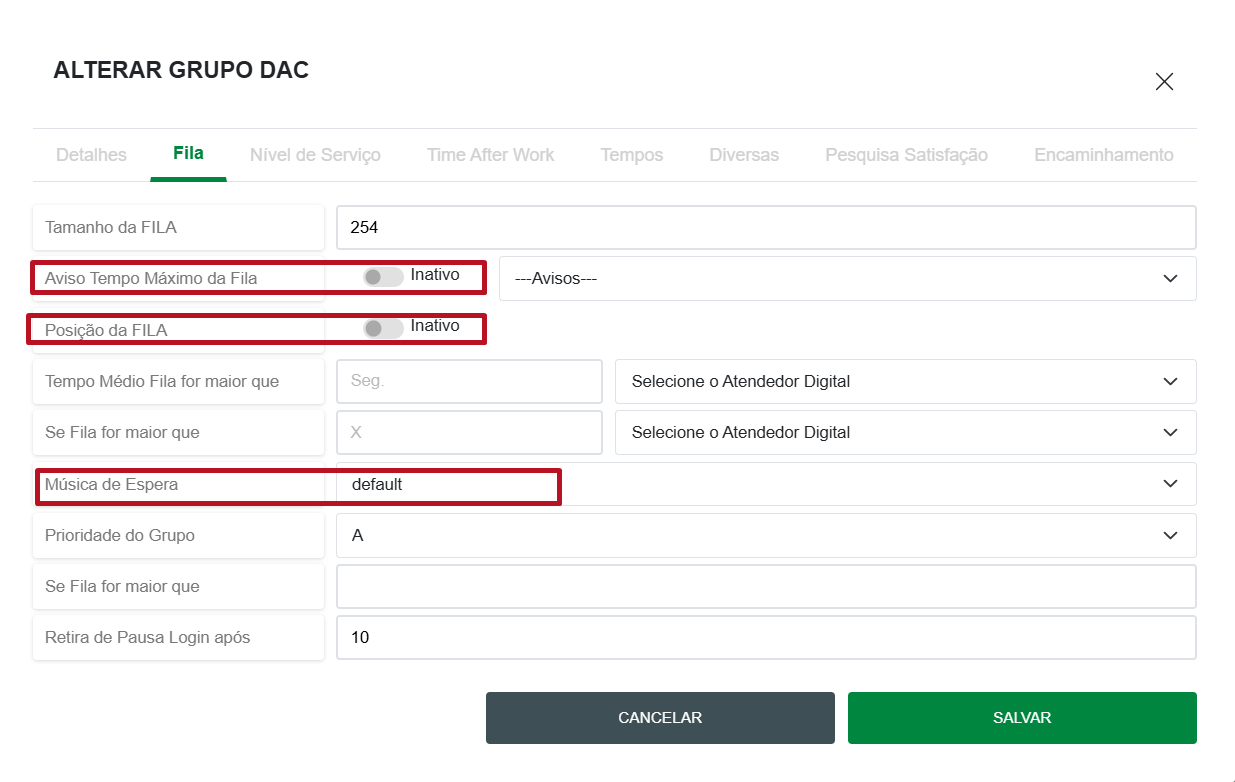 5. Na aba "Fila", ao ativar o "Aviso Tempo Máximo da Fila" enquanto o cliente aguarda para ser atendido, ele será informado do tempo médio de aguardo sonoramente. Ativando a função "Posição da FILA" ele também será informado de quantas chamadas existem aguardando na frente dele. E a função "Música de Espera" possibilita adicionar um áudio de sua central no qual será reproduzido ao cliente enquanto ele aguarda atendimento.