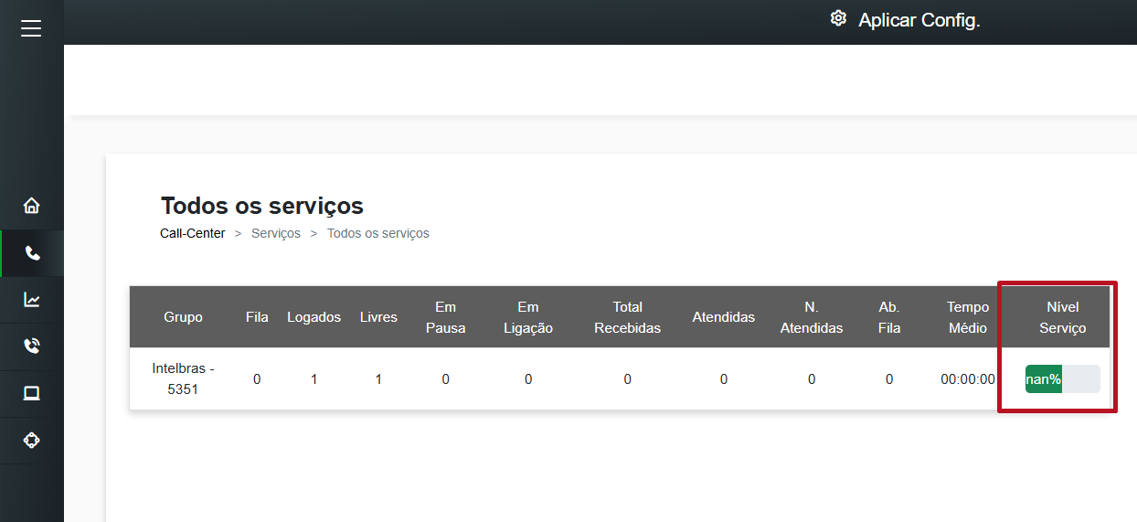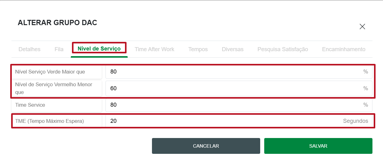 6. As configurações de Nível de Serviço têm a função de metas a serem atingidas pelos atendentes. É necessário configurar um tempo máximo de espera que será usado como parâmetro. Neste caso, por exemplo, se 80% das chamadas deste DAC forem atendidas dentro de 20 segundos o painel ficará em verde e se menos de 60% forem atendidas dentro deste tempo ficará em vermelho.