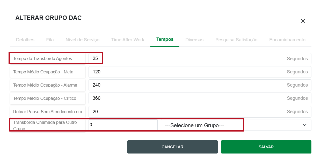 8. Em "Tempos", você pode alterar o tempo que a chamada toca em um ramal e caso não seja atendida seja transferida ao próximo livre e também redirecionar esta chamada para outro Grupo DAC dentro de um tempo determinado em "Transborda Chamada para Outro Grupo".