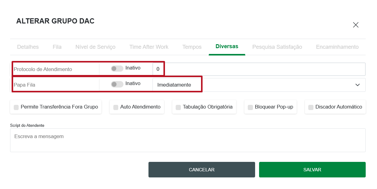Este artigo tem como objetivo auxiliar os administradores e supervisores do módulo Call Center (ramais Enterprise) a utilizarem as funções mais importantes presentes neste serviço. O Grupo DAC é um grupo de ramais que define as regras e comportamentos dos atendetes que forem vinculados a ele.