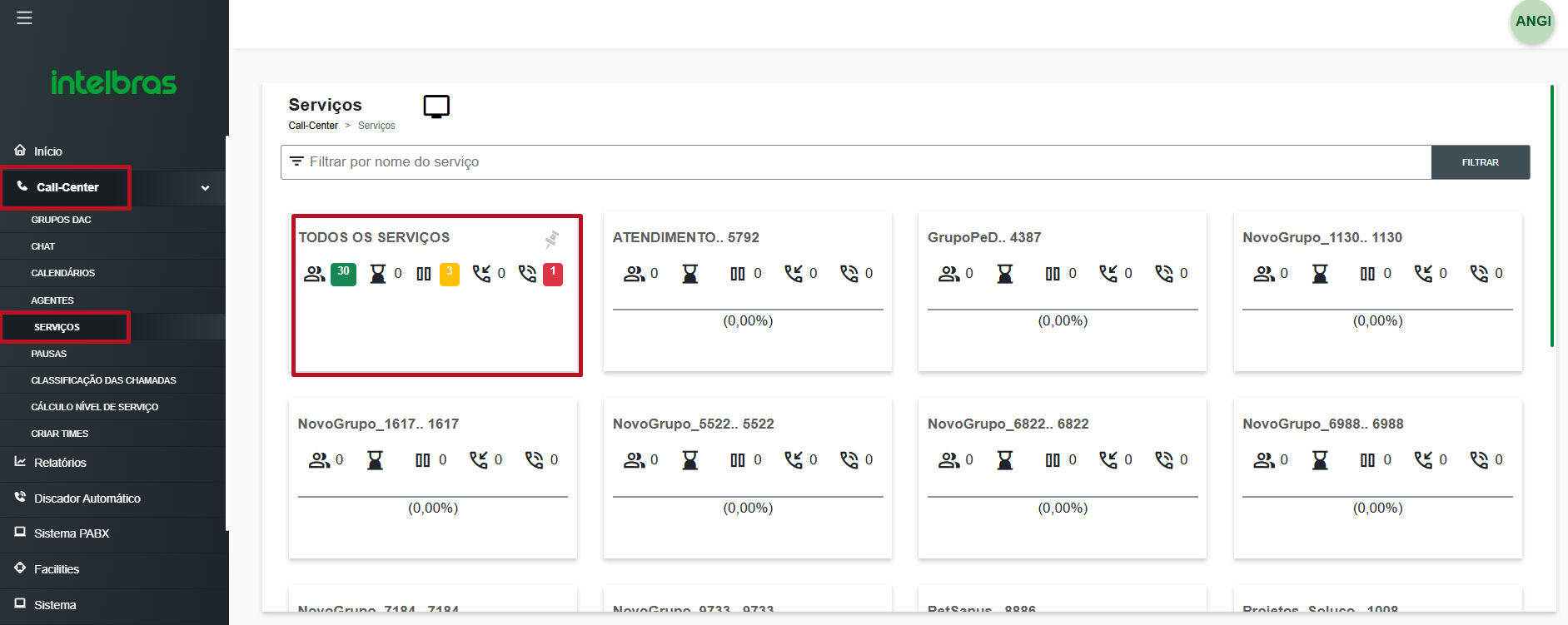 1. Acesse o menu "Call Center" -> "Serviços" e selecione o Grupo DAC que deseja monitorar. Para saber mais sobre Grupo DAC, clique aqui.