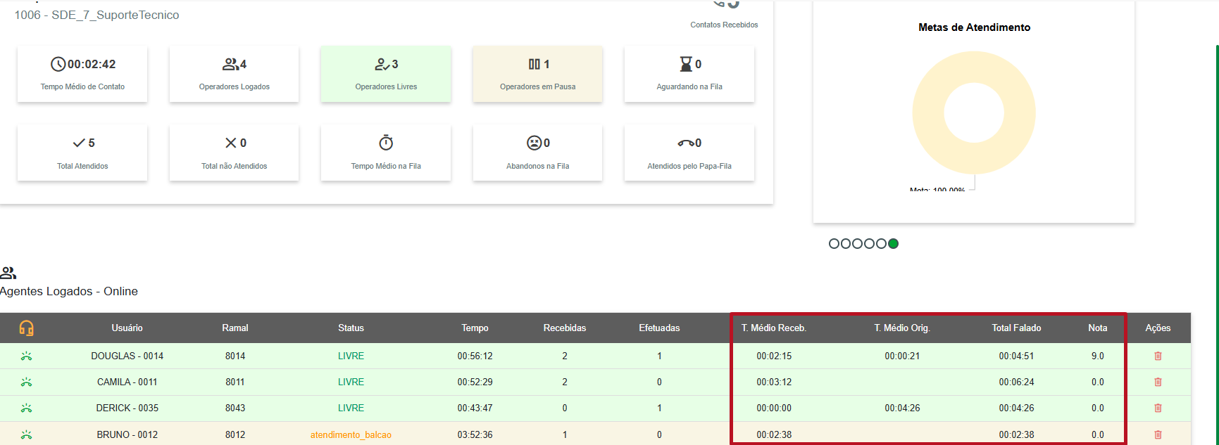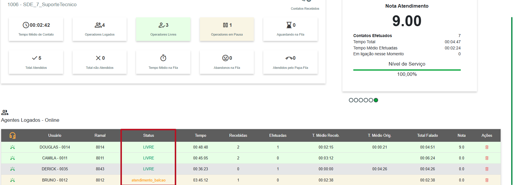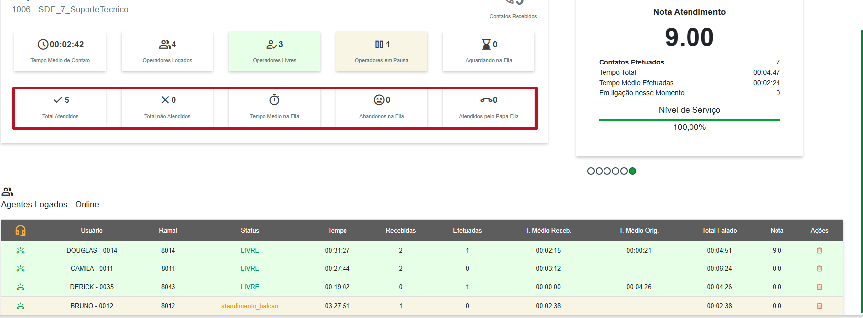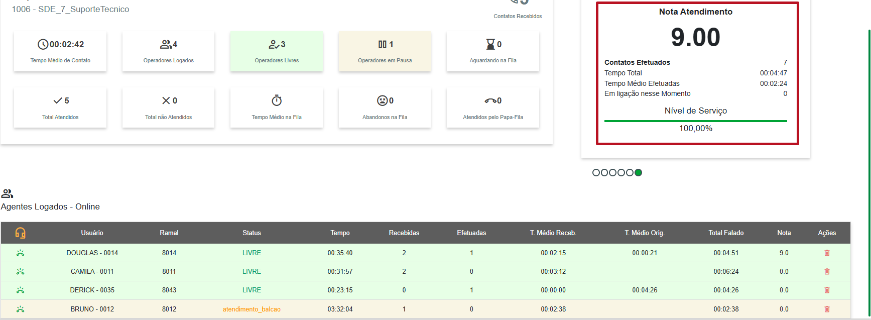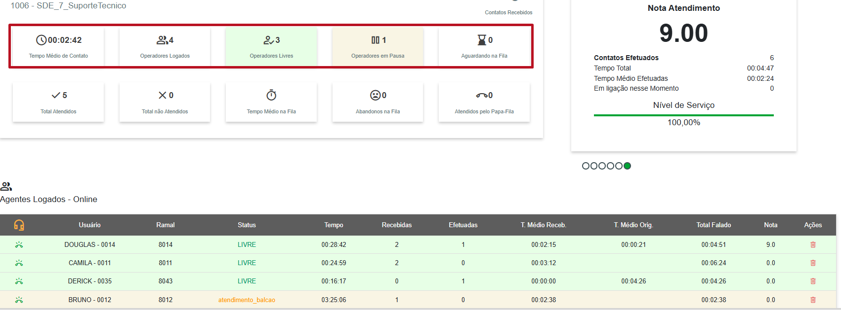 4. No quadro a direita, podemos ver a informação da média da Nota de Atendimento recebida, a quantidade de Contatos Efetuados, o Tempo Total em atendimento (informa o tempo inteiro em chamada de todos os atendentes), o Tempo Médio das chamadas efetuadas e quantos ramais estão em chamada no momento. Por fim, o Nível de Serviço que pode ser configurado também no Grupo DAC e mostra se as chamadas estão sendo atendidas dentro do tempo esperado.