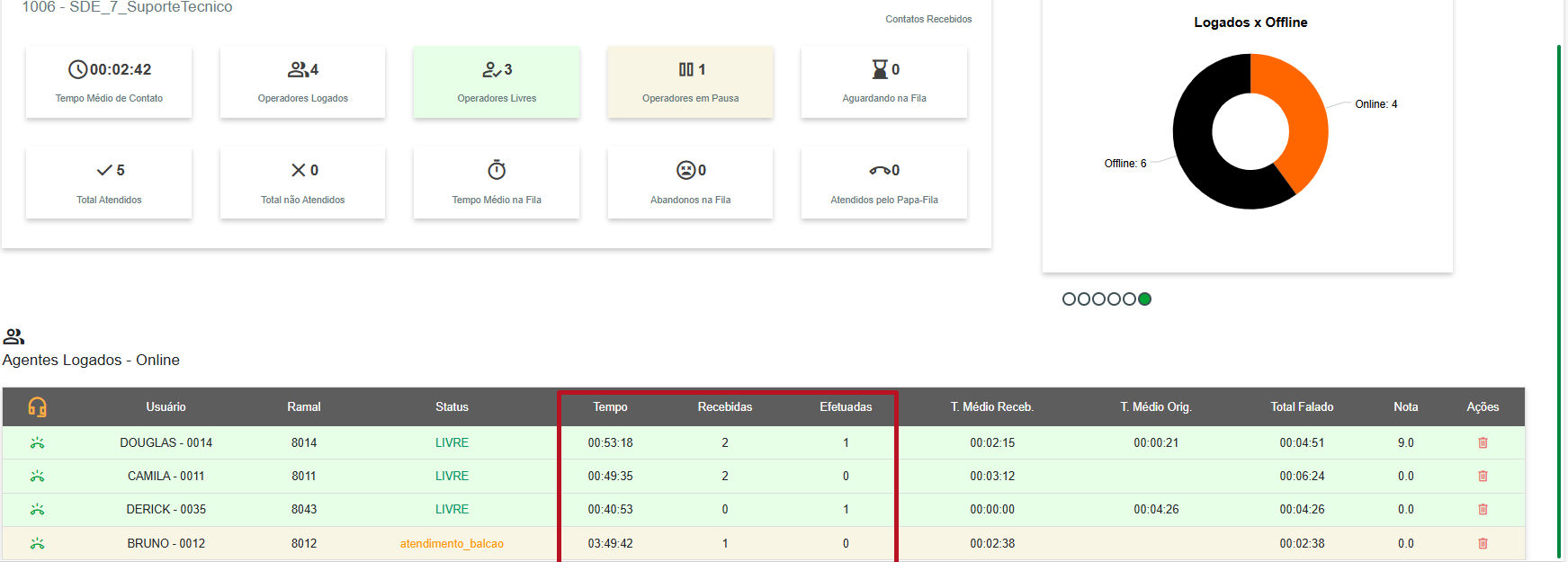 7. Nesta mesma tela a direita, podemos ver o tempo total falado pelos atendentes, a quantidade de chamadas Recebidas e Efetuadas por cada um deles também.
