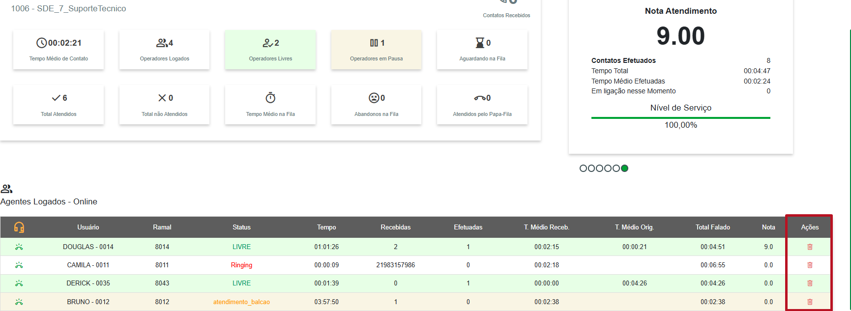 9. Por fim, o ícone de Lixeira presente ao lado de cada agente, possibilita deslogar um ramal que por ventura possa ter esquecido de o fazer ou que simplesmente precise deslogar seu ramal.