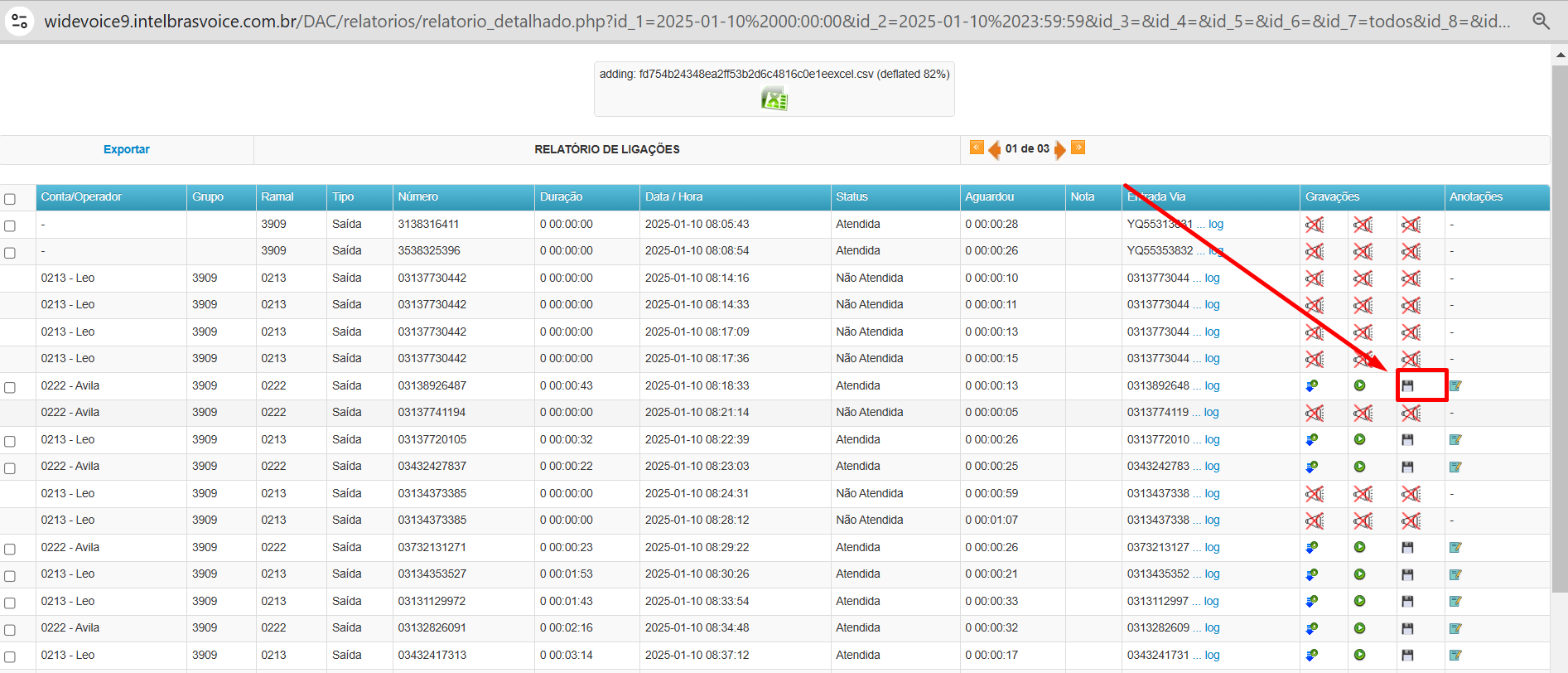 6. Para baixar a gravação de uma chamada, clique em cima do ícone de disquete na chamada desejada.