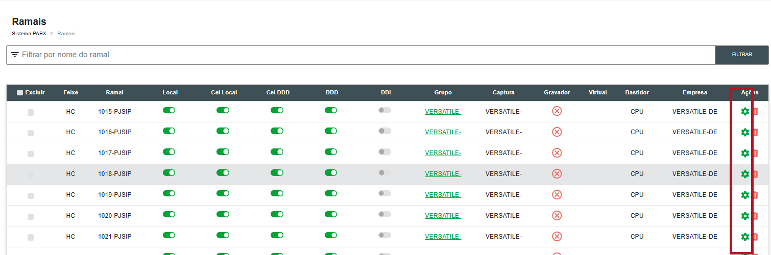 3. Clique no ícone de engrenagem do ramal que deseja "virtualizar".