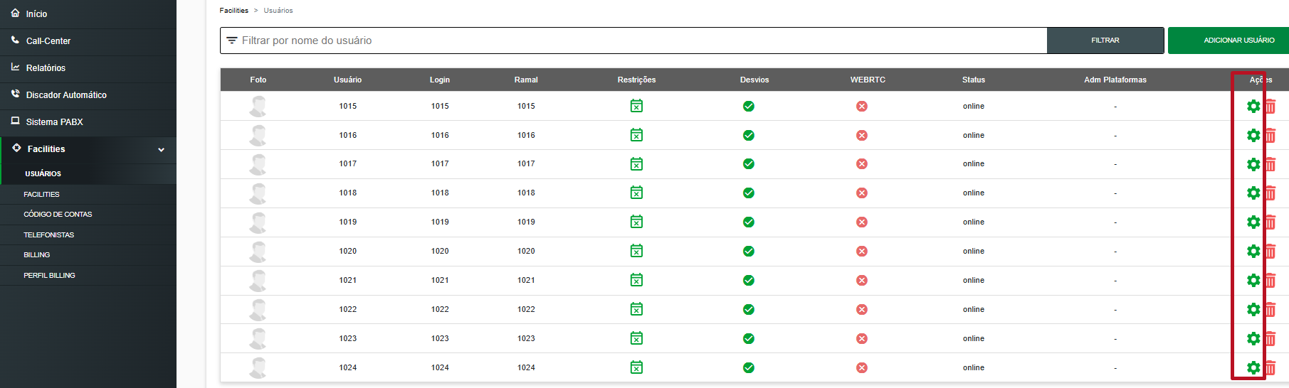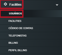 5. Para fazer binar/identificar nas chamadas o ramal virtual configurado, acesse o menu "Facilities" -> "Usuários".
