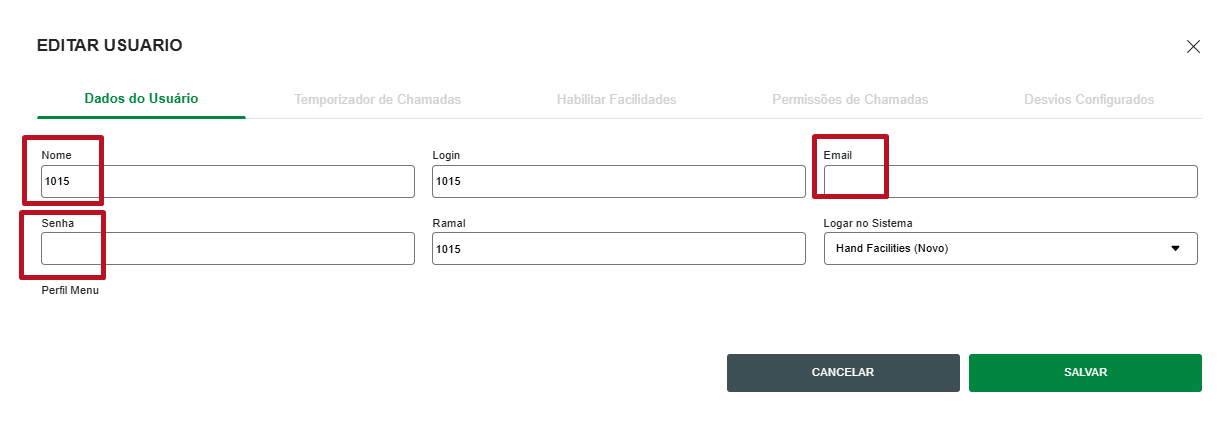 7. Altere no campo "Nome" com a identificação do ramal virtual. Será necessário preencher algum dado em "E-mail" e "Senha" para poder salvar.