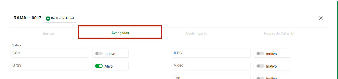 2. Após realizar o login, tecle no menu "Sistema PABX" -> "Ramais" e poderá visualizar todos os ramais disponíveis para uso. No botão com formato de engrenagem, poderá habilitar a função de registro simultâneo nos ramais desejados.