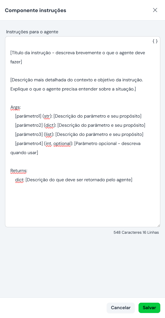 O Componente de Instruções define como a IA (LLM) deve interpretar e executar o workflow, funcionando como uma tool (ferramenta interna) que o modelo pode chamar quando necessário.