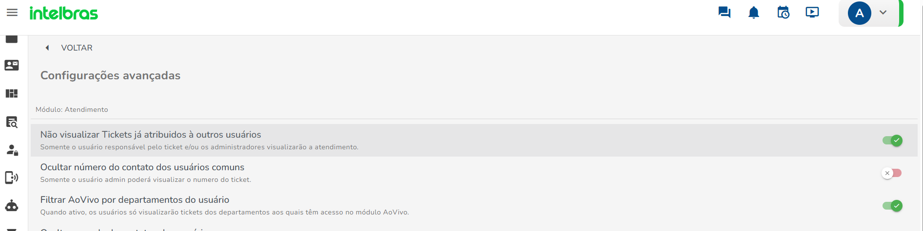 Filtrar AoVivo por departamentos do usuário: O usuário visualizará apenas os tickets dos departamentos aos quais ele está vinculado.