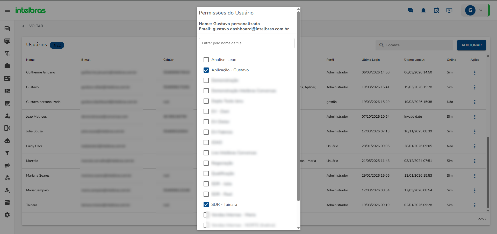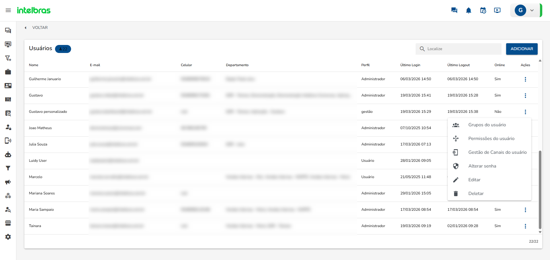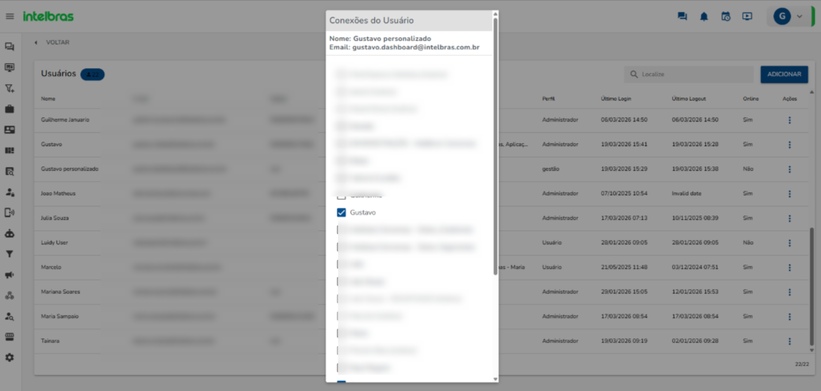 A plataforma permite a criação de perfis personalizados para controlar o nível de acesso às funcionalidades do sistema, restringindo ou liberando permissões conforme a necessidade de cada função.